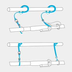 - Position the adjustable webbing loop around the oar on the blade side of the oar stopper; adjust metal ladder lock until snug.